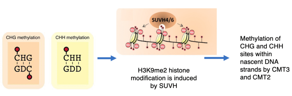 In addition, the presence of H3K9me2 recruits CMT2, which introduces methylation at CHH sites on the nascent strand.