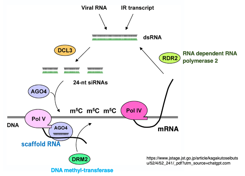 In seed plants, RNA-directed DNA methylation (RdDM) suppresses the expression of transposons, repetitive sequences, and viruses by blocking the initiation of their transcription.