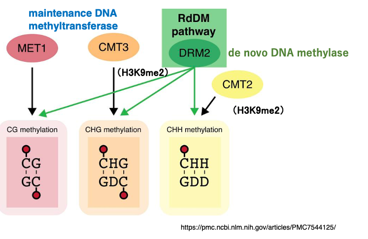 For CG sequences, even in the absence of H3K9me2 modification, the maintenance-type DNA methyltransferase MET1 methylates the cytosines on the daughter strand at the corresponding positions.