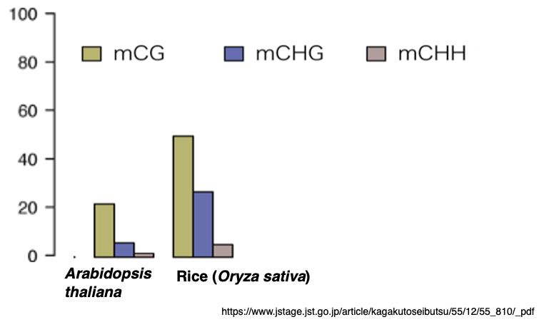 This figure shows the frequencies of CG, CHG, and CHH methylation in Arabidopsis thaliana and rice.