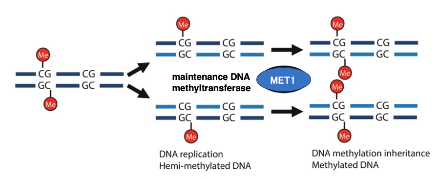 At CG sites, the maintenance DNA methyltransferase MET1 acts on the cytosine in the daughter strand opposite the 5mCG on the parental strand, introducing a methyl group. The efficiency of this MET1-mediated methylation of the nascent strand is considered relatively high.