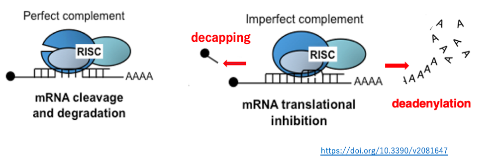 When the complementarity between siRNA and its target mRNA is very high, the mRNA is cleaved (left figure). If the siRNA–mRNA pairing contains regions of partial mismatch, cleavage does not occur; instead, translation inhibition takes place through mechanisms such as the promotion of mRNA degradation (right figure). Such RNAi-mediated translational repression is observed in a wide range of eukaryotes, suggesting that this mechanism was acquired early in eukaryotic evolution.