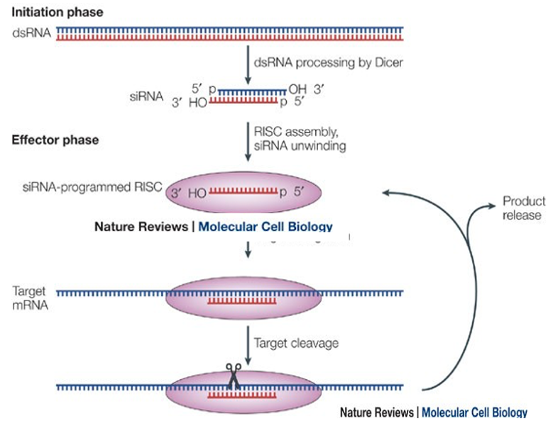 In the RNAi pathway, mRNAs derived from viruses or transposons are converted into double-stranded RNA (dsRNA) by RNA-dependent RNA polymerase (RDRP). These dsRNAs are then cleaved by Dicer into double-stranded fragments of 21 nucleotides. One strand of each fragment is incorporated into an Argonaute protein, and together with several other proteins forms an active RNA-Induced Silencing Complex (RISC). Within RISC, the siRNA base-pairs with complementary sequences in specific target mRNAs.