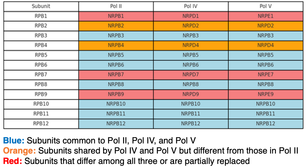As shown in this figure, the three polymerases share seven subunits (light blue), while three subunits are unique to each (red). In addition, Pol IV and Pol V share two subunits with each other but not with Pol II (orange). Because of these shared subunits, Pol IV and Pol V are thought to have arisen from Pol II during the evolution of seed plants.