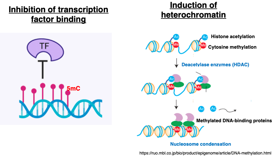 Two primary mechanisms are thought to explain how 5-methylcytosine (5mC) suppresses transcription initiation: